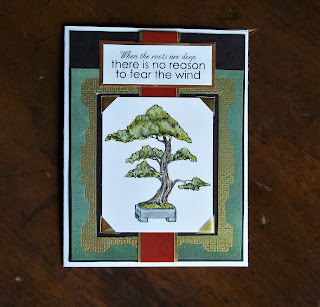 The Asian inspired papers on your next card are wonderful, the colours are beautiful and the gold highlights really add a richness to the project. I like the addition of the white gel pen on the bonsai too.