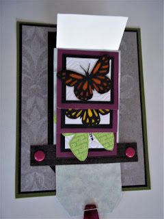 Kathy- What a creative fold- looks like a lotta fun to unfold- especially with that little burgundy ribbon! Love the butterfly with the green verbiage and bling on it's body. The arched sentiment is really clever! Super card. Thanks for entering JDS Blog Challenge #11! Good luck and be safe.