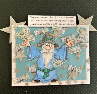 For this challenge, I couldn’t decide which image I’d like to use on my DT card… so I decided to make TWO cards! The first card features a wonderful wizard from Dr. Digi. It was so fun to create this card. Except for the fact that when I shared it with my hubby he called me a counterfeiter! Ha! (It's okay... I copied pics of play money I found on the web- and cite the source in my supplies list. So, I did nothing illegal in the making of this card!) The fun sentiment on this card is a variation of one that used to be sold by a company named Victorine Originals which is no longer in business. It is what inspired me to add the flurry of fake money to the card.